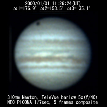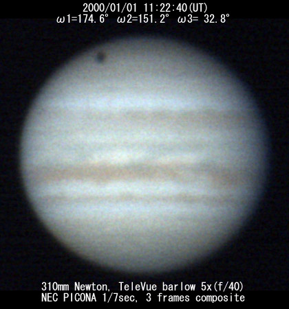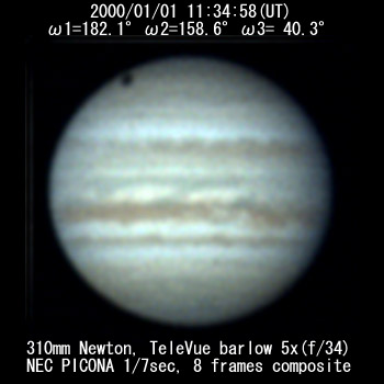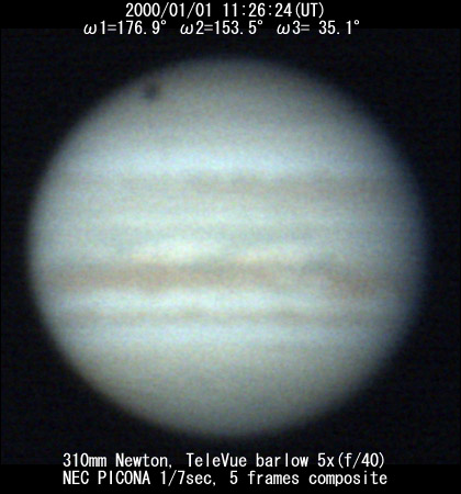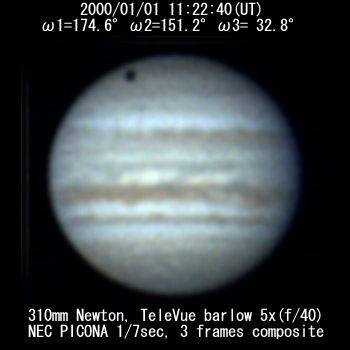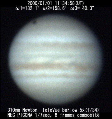 ![]() No.208 2000/01/01 11:34:58(UT) I=182.1 II=158.6 III= 40.3 De=+3.1 Dia=42.61" |