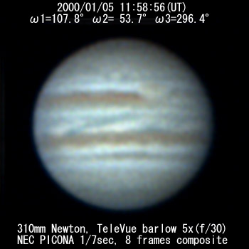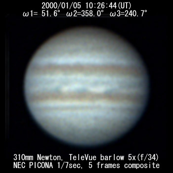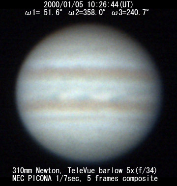 ![]() No.212 2000/01/05 10:26:44(UT) I= 51.6 II=358.0 III=240.7 De=+3.1 Dia=42.05" |