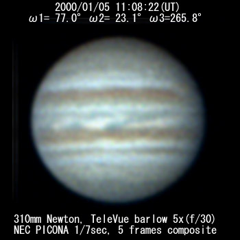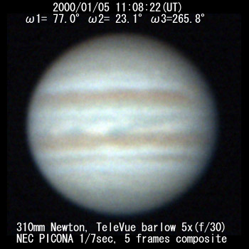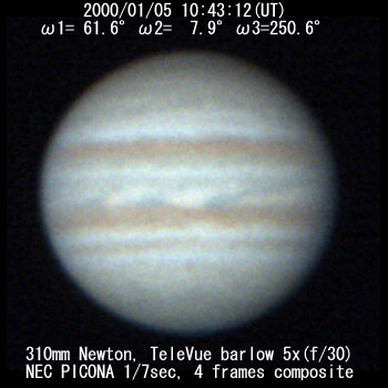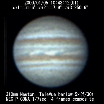 ![]() No.214 2000/01/05 11:08:22(UT) I= 77.0 II= 23.1 III=265.8 De=+3.1 Dia=42.05" |