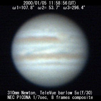 ![]() No.215 2000/01/05 11:58:56(UT) I=107.8 II= 53.7 III=296.4 De=+3.1 Dia=42.05" |