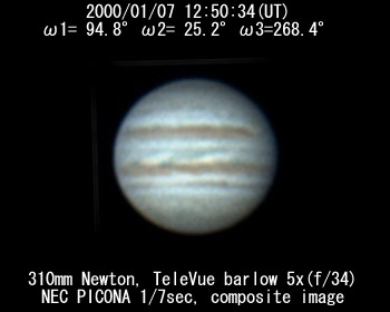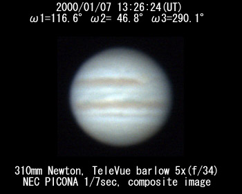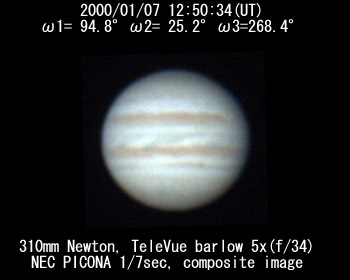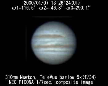 ![]() No.216 2000/01/07 12:50:34(UT) I= 94.8 II= 25.2 III=268.4 De=+3.1 Dia=41.75" |