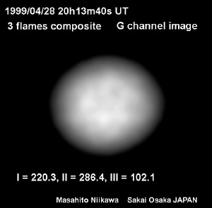 | I = 220.3, II = 286.4, III = 102.1 3 flames composite Seeing:1/10 Transp.:1/6 今朝、木星の初観測を行いました。眼視では、なんとか2本の模様を確認。 撮像タイムは、1999/04/29 05h07m52s JSTです。2軒隣の家の屋根から木星が顔を出したのが、4h50mでした。 もちろん、超低空で、雲を通してであったので、像はふにゃふにゃ、なんとなく、2本の模様がわかるかな?いや、どうかな?という程度です。 | |