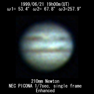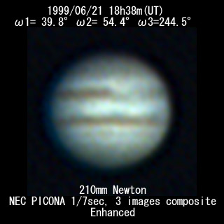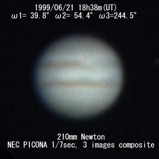 ![]() No. 2 1999/06/21 18h38m(UT) I= 39.8 II= 54.4 III=244.5 210mm Newton 3 images composite |