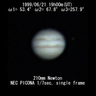 ![]() No. 3 1999/06/21 19h00m(UT) I= 53.4 II= 67.8 III=257.9 210mm Newton single image |