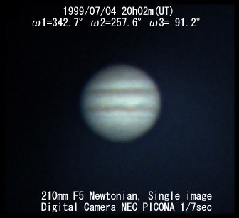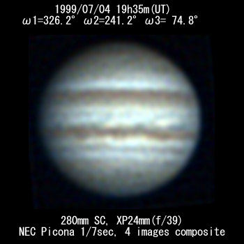 ![]() No. 5 1999/07/04 20:01:56(UT) I=342.7 II=257.6 III= 91.2 210mm Newton(F5) NEC Picona 1/7sec single frame |