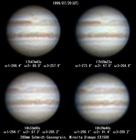 ![]() No. 5 1999/07/20 18:22:40(UT) I=287.8 II= 81.1 III=278.9 De= +3.3゜E.Dia=39.83" |