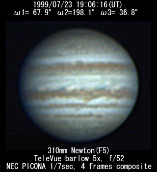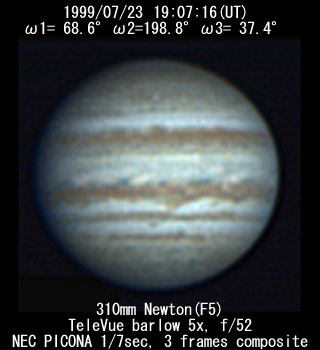 ![]() No. 27 1999/07/23 18:51:40(UT) I= 59.1 II=189.3 III= 28.0 De= +3.3 E.Dia=40.20" |