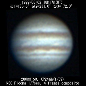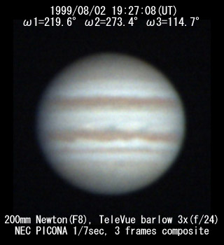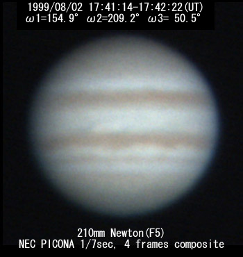 ![]() No. 12 1999/08/02 17:41:14-17:42:22(UT) I=154.9 II=209.2 III= 50.5 De= +3.4゜E.Dia=41.49" 210mm Newton(F5) NEC Picona 1/7sec 4 frames composite |