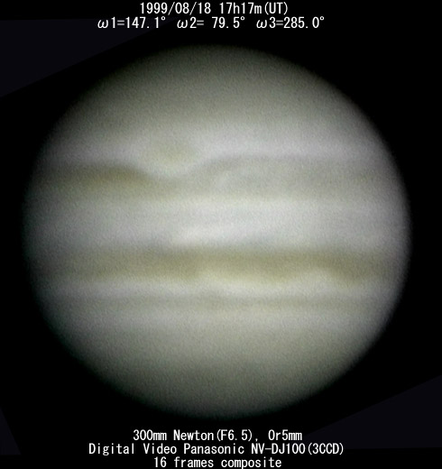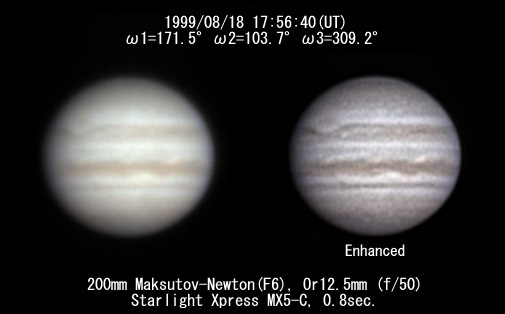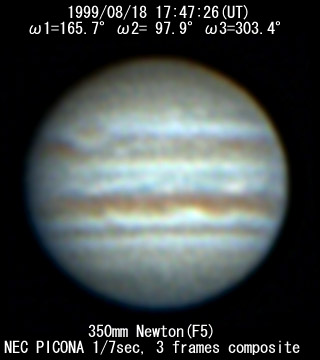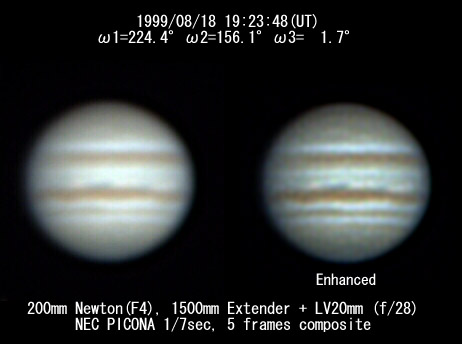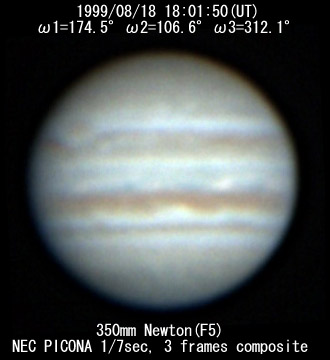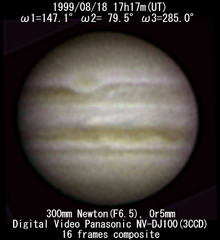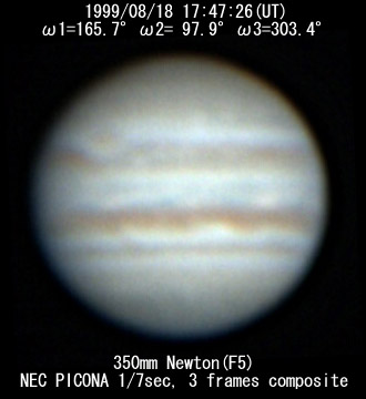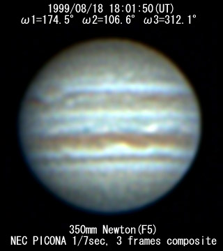 ![]() No. 34 1999/08/18 17h47m(UT) I=165.7 II= 97.9 III=303.4 350mm Newton(F5) NEC PICONA 1/7sec | ![]() 強調画像作成:伊賀 | |