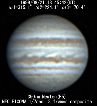 ![]() No. 37 1999/08/21 19h47m(UT) I=352.3 II=261.0 III=107.4 350mm Newton(F5) NEC PICONA 1/7sec | ![]() 強調画像作成:伊賀 | |