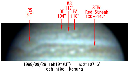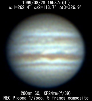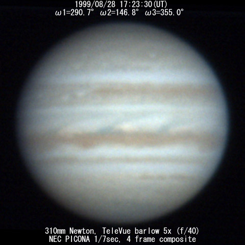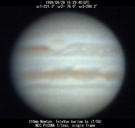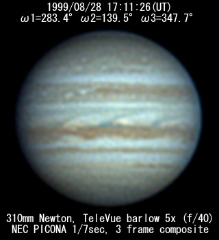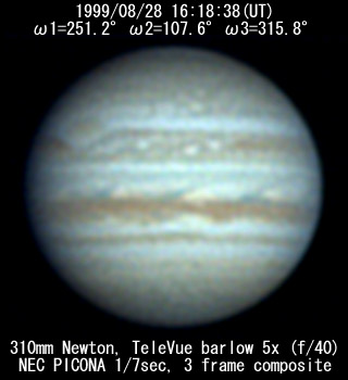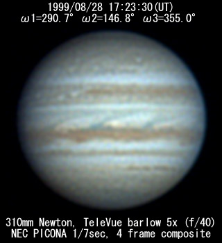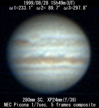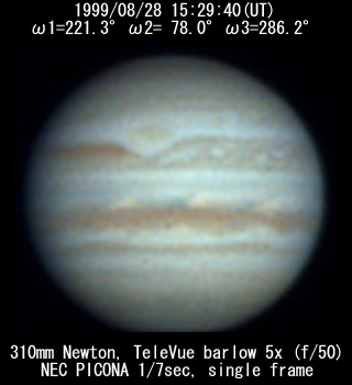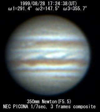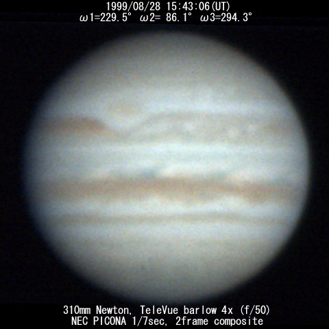 ![]() No. 43 1999/08/28 17:24:38(UT) I=291.4 II=147.5 III=355.7 350mm Newton(F5) NEC PICONA 1/7sec 3 frames composite | ![]() 強調画像作成:伊賀 | |