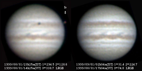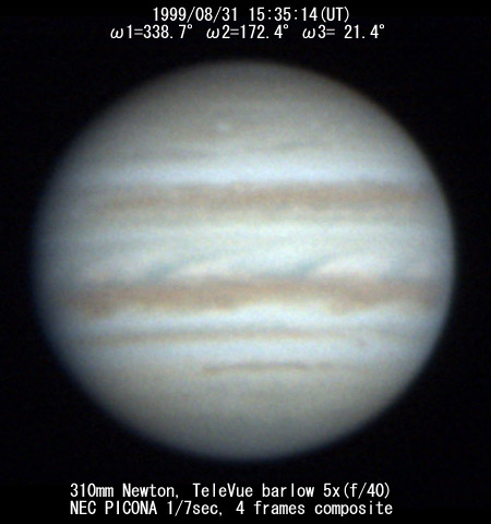 ![]() No. 71 1999/08/31 15:35:14(UT) I=338.7 II=172.4 III= 21.4 De= +3.5 E.Dia=45.44" |