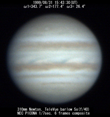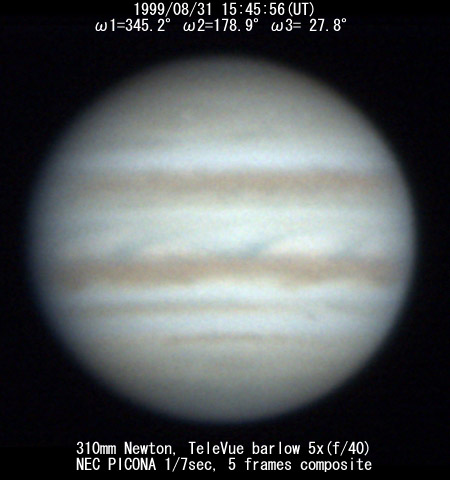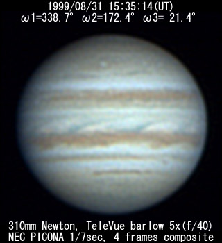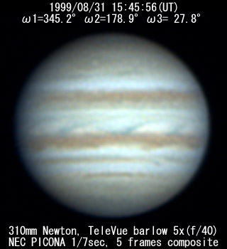 ![]() No. 72 1999/08/31 15:43:30(UT) I=343.7 II=177.4 III= 26.4 De= +3.5 E.Dia=45.44" |