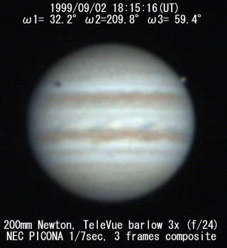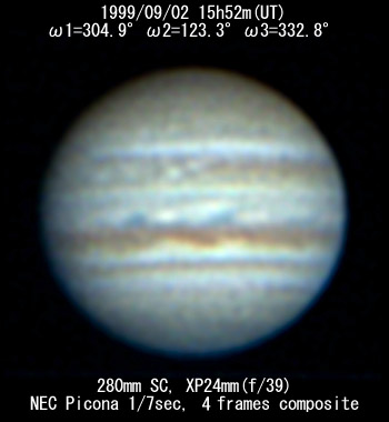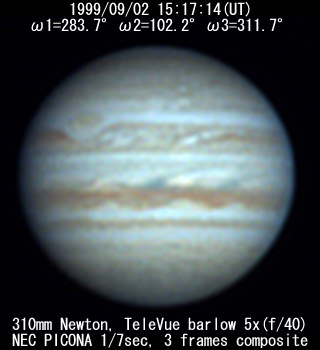 I=311.6 II=129.9 III=339.4 280mm Schmidt-Cassegrain, XP24mm(f/39) NEC Picona 1/7sec, 3 frames composite Seeing:5/10 Transp.:3/5