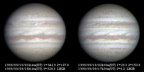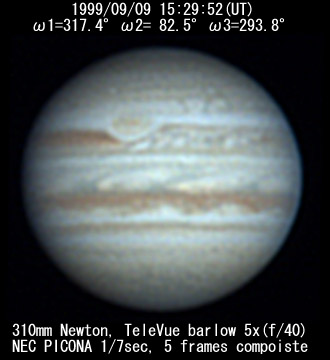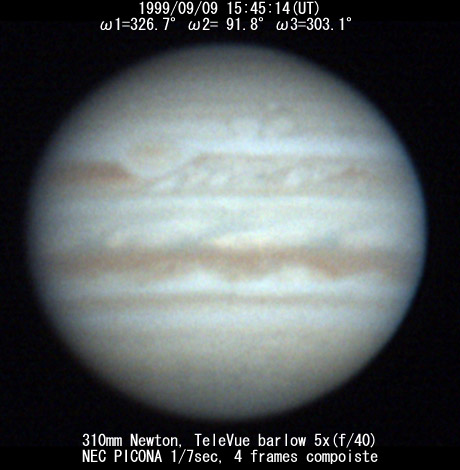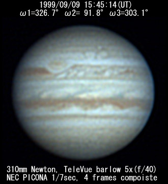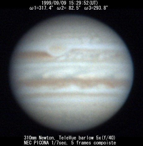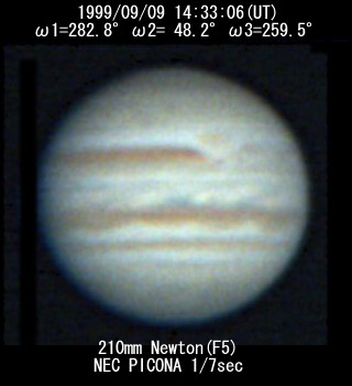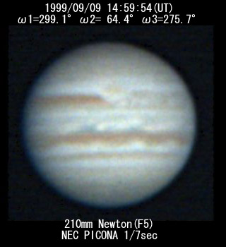 ![]() No. 15 1999/09/09 14:34:06(UT) I=282.8 II= 48.2 III=259.5 210mm Newtonr(F5) NEC Picona 1/7sec |