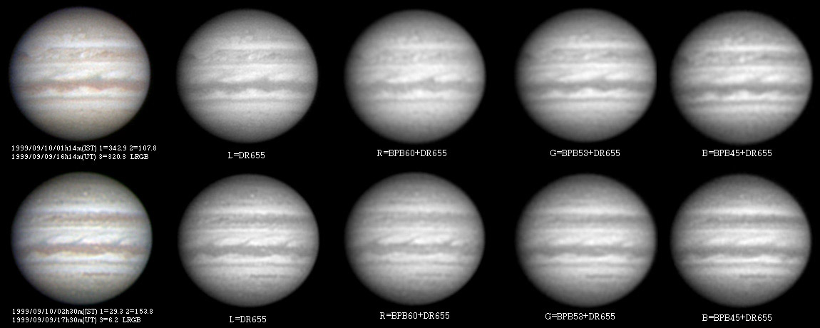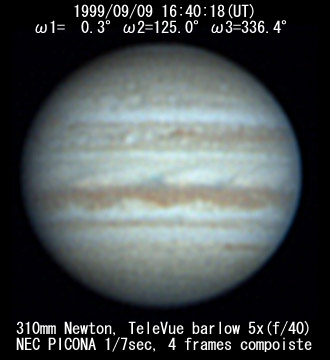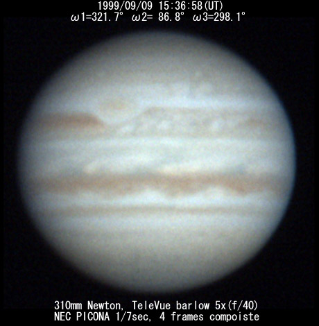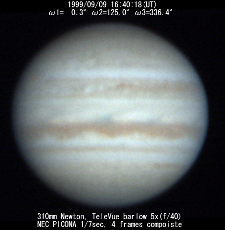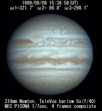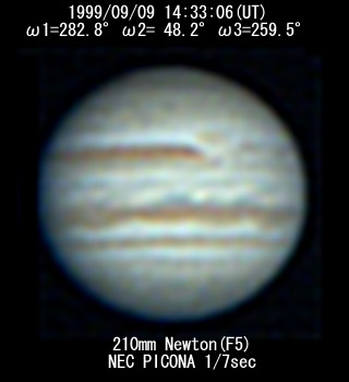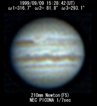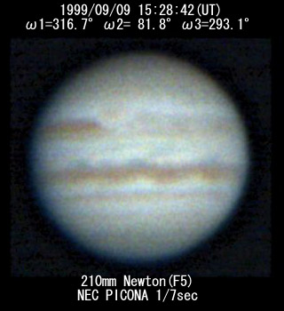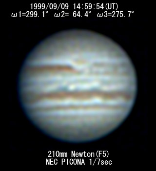 ![]() No. 16 1999/09/09 14:59:54(UT) I=299.1 II= 64.4 III=275.7 210mm Newtonr(F5) NEC Picona 1/7sec |