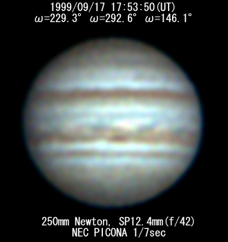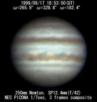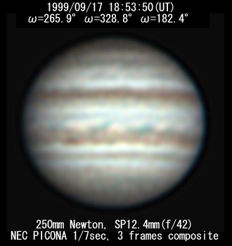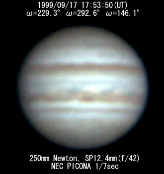 ![]() No. 3 1999/09/17 18:53:50(UT) I=265.9 II=328.8 III=182.4 De= +3.6゜E.Dia=47.56" | ![]() (強調画像 作成:伊賀)