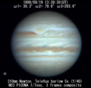 ![]() No. 92 1999/09/19 13:39:30(UT) I= 30.3 II= 79.6 III=293.6 De= +3.6 E.Dia=47.76" |