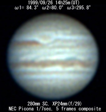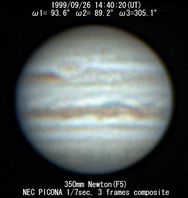 ![]() No. 50 1999/09/26 14:40:20(UT) I= 93.6 II= 89.2 III=305.1 350mm Newton(F5) NEC PICONA 1/7sec 3 frames composite | ![]() 強調画像作成:伊賀 | |