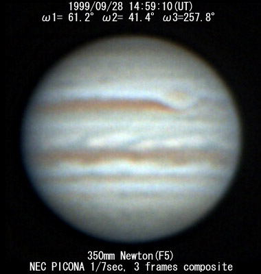 ![]() No. 52 1999/09/28 14:59:10(UT) I= 61.2 II= 41.4 III=257.8 350mm Newton(F5) NEC PICONA 1/7sec 3 frames composite | ![]() 強調画像作成:伊賀 | |