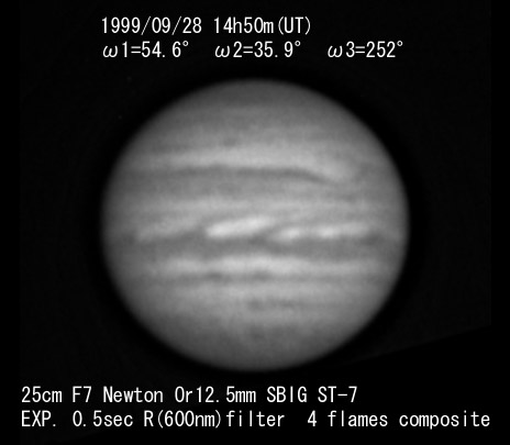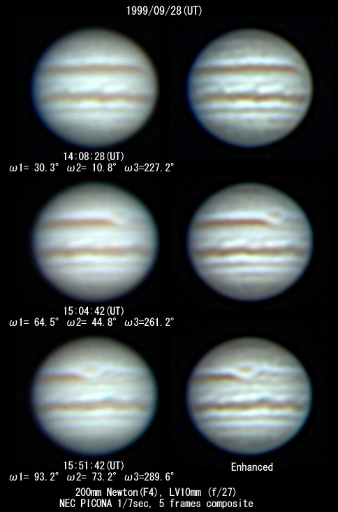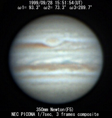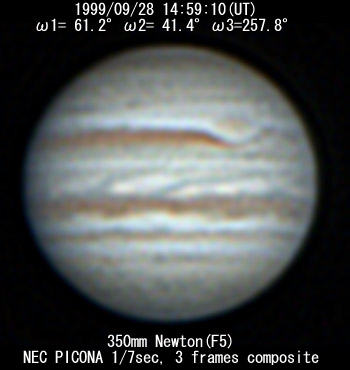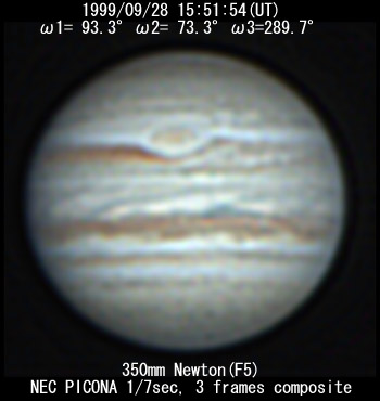 ![]() No. 53 1999/09/28 15:51:54(UT) I= 93.3 II= 73.3 III=289.7 350mm Newton(F5) NEC PICONA 1/7sec 3 frames composite | ![]() 強調画像作成:伊賀 | |