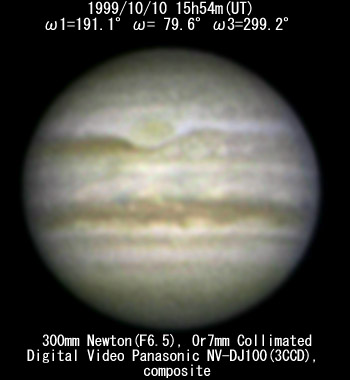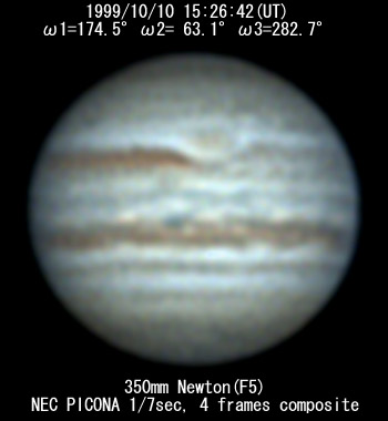 ![]() No. 63 1999/10/10 14:17:30(UT) I=132.3 II= 21.2 III=240.8 350mm Newton(F5), f/30 NEC PICONA 1/7sec 3 frames composite | ![]() 強調画像作成:伊賀 | |