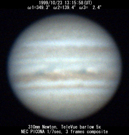 ![]() No.129 1999/10/23 13:15:58(UT) I=349.3 II=139.4 III= 2.4 | ![]() 310mm Newton(F5) TeleVue barlow 5x NEC PICONA 1/7sec 3 frames composite