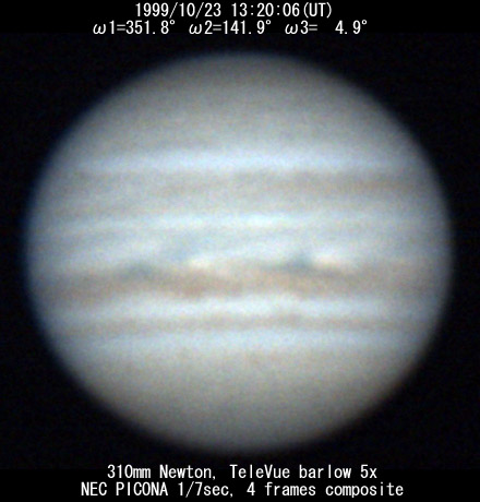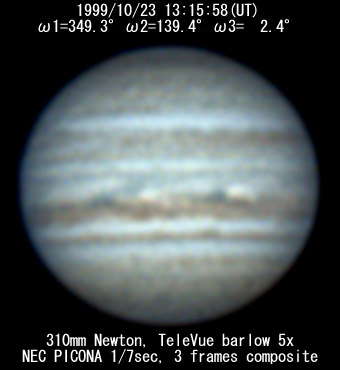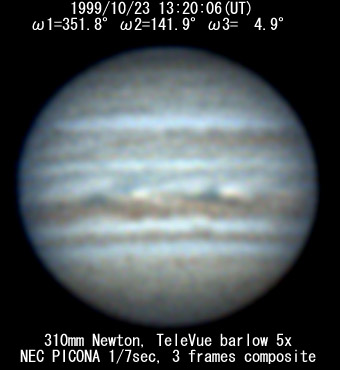 ![]() No.130 1999/10/23 13:20:06(UT) I=351.8 II=141.9 III= 4.9 | ![]() 310mm Newton(F5) TeleVue barlow 5x NEC PICONA 1/7sec 3 frames composite