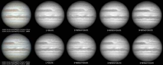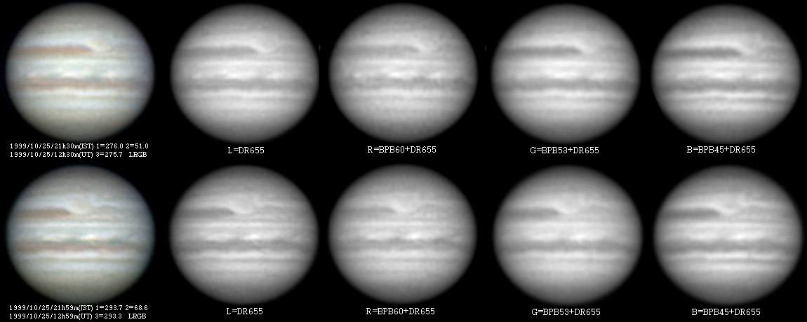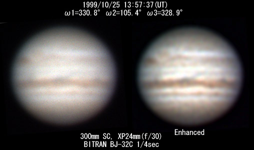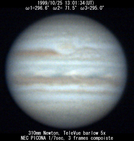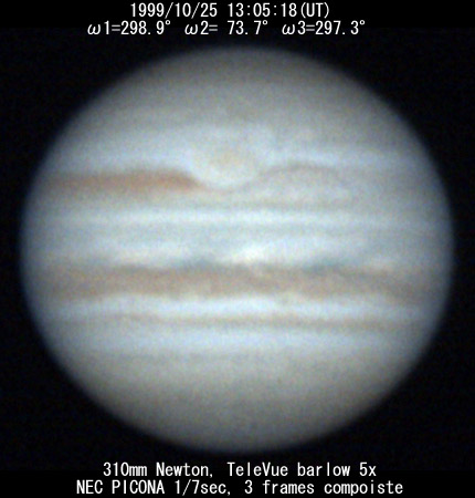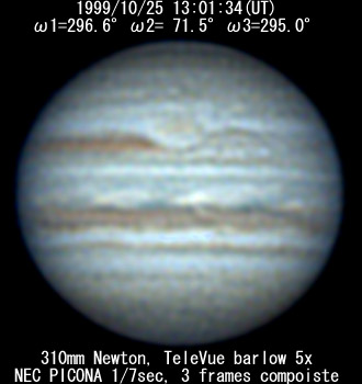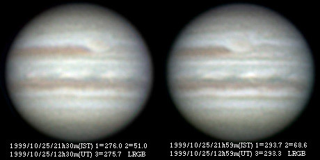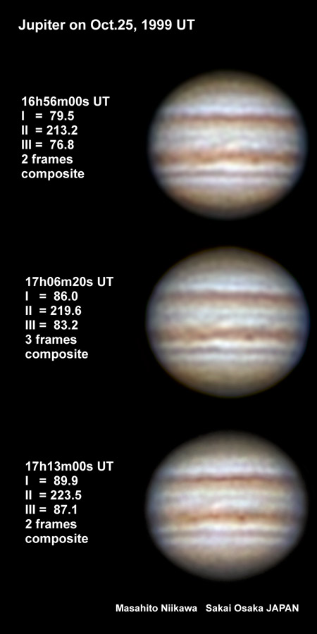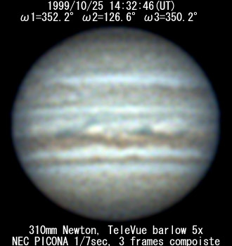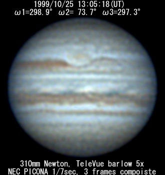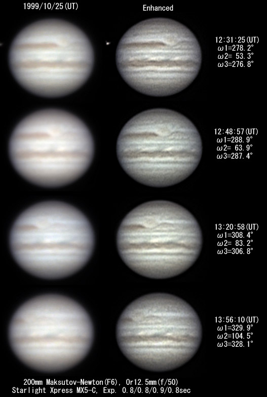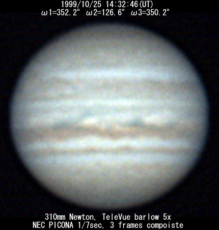 1999/10/25 17h06m20s(UT) I= 86.0 II=219.6 III= 83.2 3 frames composite 1999/10/25 17h13m00s(UT) I= 89.9 II=223.5 III= 87.1 2 frames composite Telescope : C11 (SC) D=280mm fl=2800mm Camera :Minolta DimageEx1500 Digital Camera taking lens removed Effective F No.: 25 (XP24mm Eyepiece Projection) Filter: IR cut & Low-pass built-in the camera Obs.site : Mozuhonmachi Sakai-City Osaka Japan Exposure : 1/8 sec Analog gain:6dB Seeing:3/10 Transp.:4/6