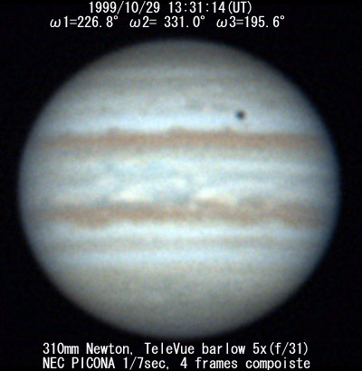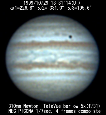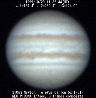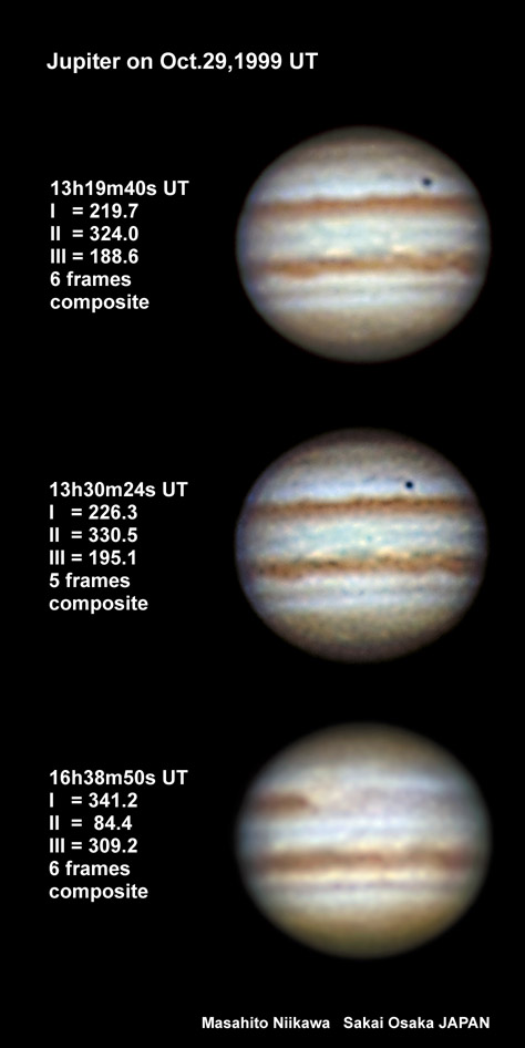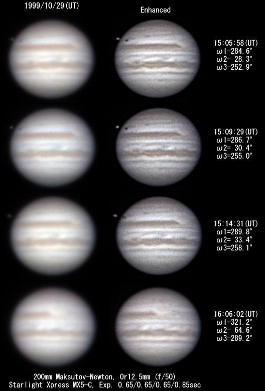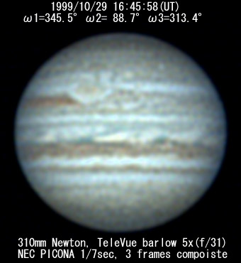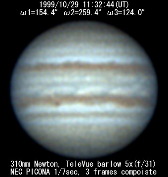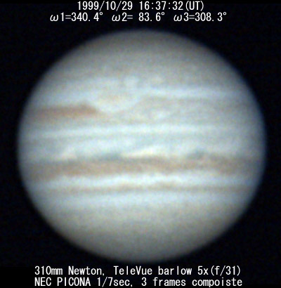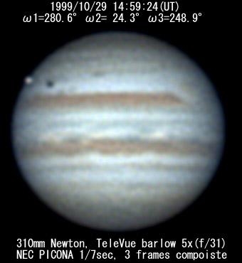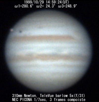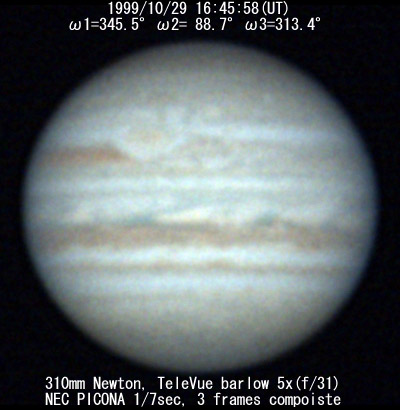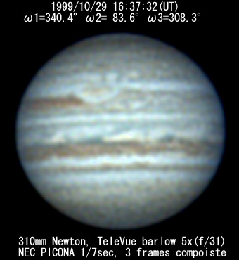 1999/10/29 13h30m24s(UT) I=226.3 II=330.5 III=195.1 5 frames composite 1999/10/29 16h38m50s(UT) I=341.2 II= 84.4 III=309.2 6 frames composite Telescope : C11 (SC) D=280mm fl=2800mm Camera :Minolta DimageEx1500 Digital Camera taking lens removed Effective F No.: 25 (XP24mm Eyepiece Projection) Filter: IR cut & Low-pass built-in the camera Obs.site : Mozuhonmachi Sakai-City Osaka Japan Exposure : 1/8 sec Analog gain:6dB Seeing:6->2/10 Transp.:3->2/6