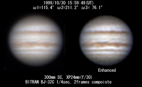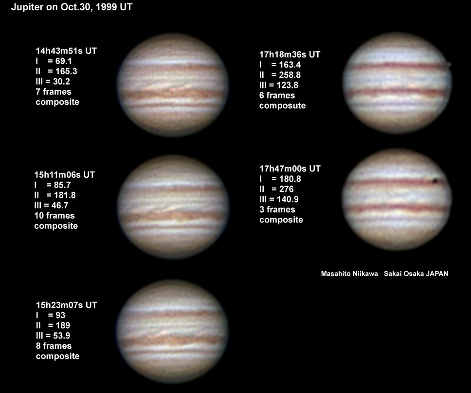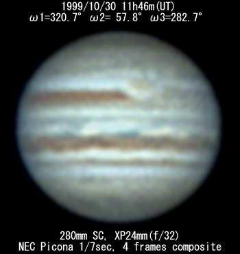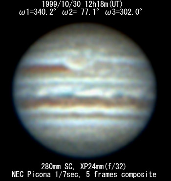 1999/10/30 15h11m06s(UT) I= 85.7 II=181.8 III= 46.7 10 frames composite 1999/10/30 15h23m07s(UT) I= 93.0 II=189.0 III= 53.9 8 frames composite 1999/10/30 17h18m36s(UT) I=163.4 II=258.8 III=123.8 6 frames composite 1999/10/30 17h47m00s(UT) I=180.8 II=276.0 III=140.9 3 frames composite Telescope : C11 (SC) D=280mm fl=2800mm Camera :Minolta DimageEx1500 Digital Camera taking lens removed Effective F No.: 25 (XP24mm Eyepiece Projection) Filter: IR cut & Low-pass built-in the camera Obs.site : Mozuhonmachi Sakai-City Osaka Japan Exposure : 1/8 sec Analog gain:6dB Seeing:5->2/10 Transp.:3/6