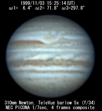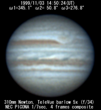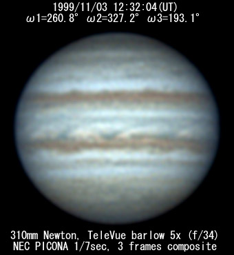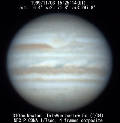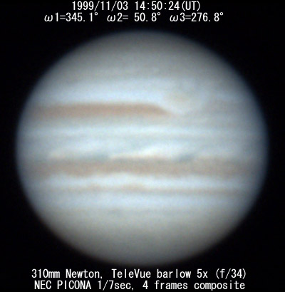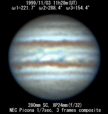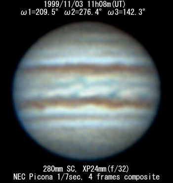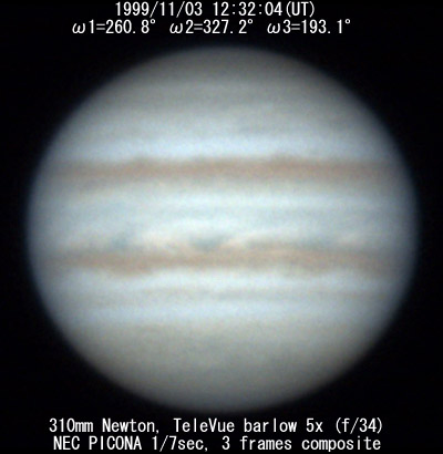 I=209.5 II=276.4 III=142.3 280mm Schmidt-Cassegrain, XP24mm(f/32) NEC Picona 1/7sec, 4 frames composite Seeing:6/10 Transp.:3/5