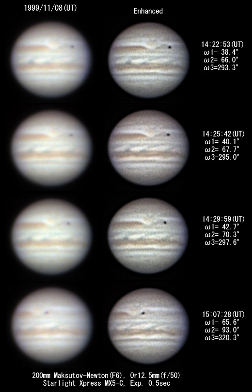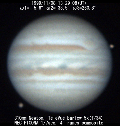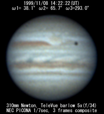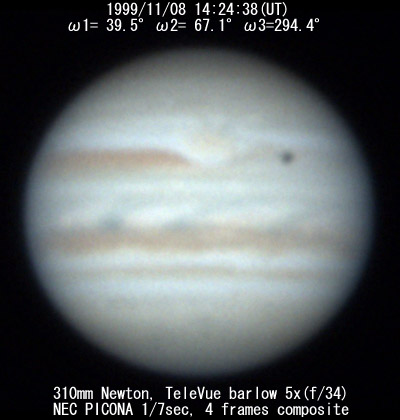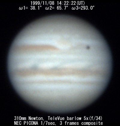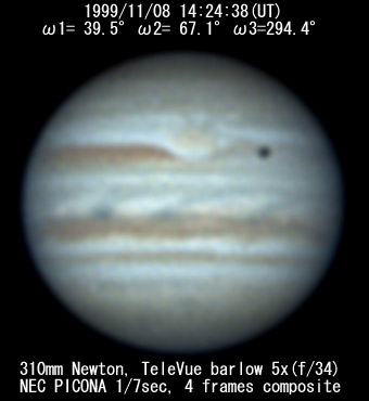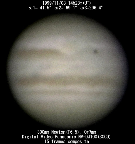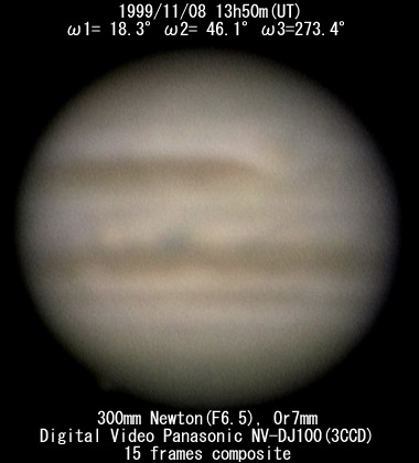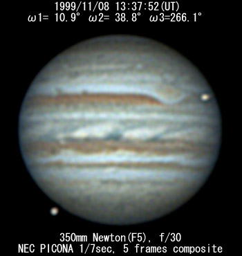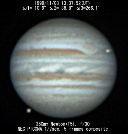 ![]() No. 73 1999/11/08 13:37:52(UT) I= 10.9 II= 38.8 III=266.1 350mm Newton(F5), f/30 NEC PICONA 1/7sec 3 frames composite | ![]() Enhanced by Y.Iga | |