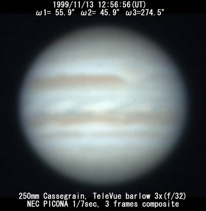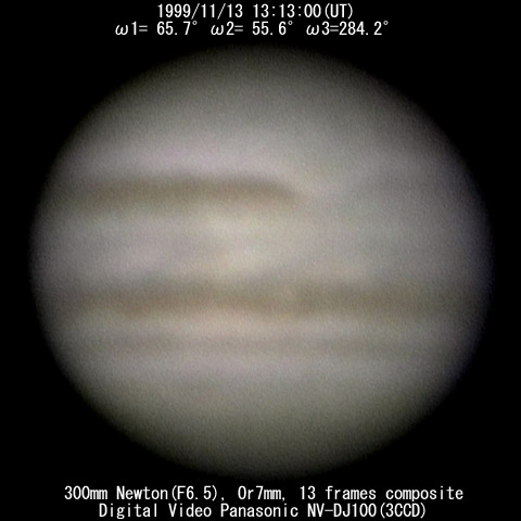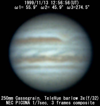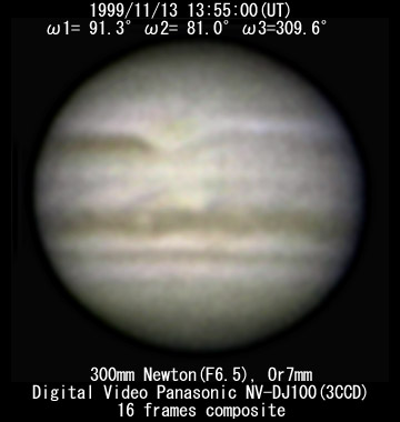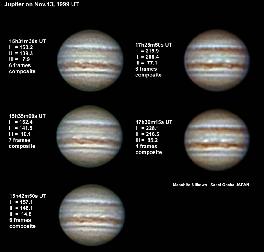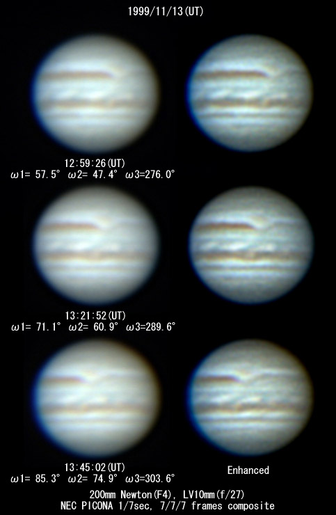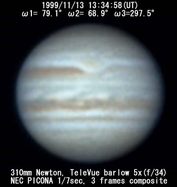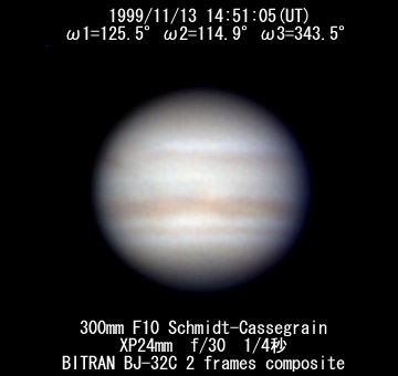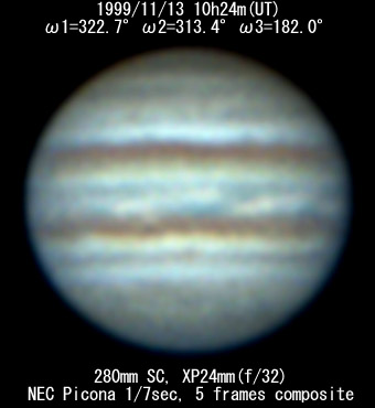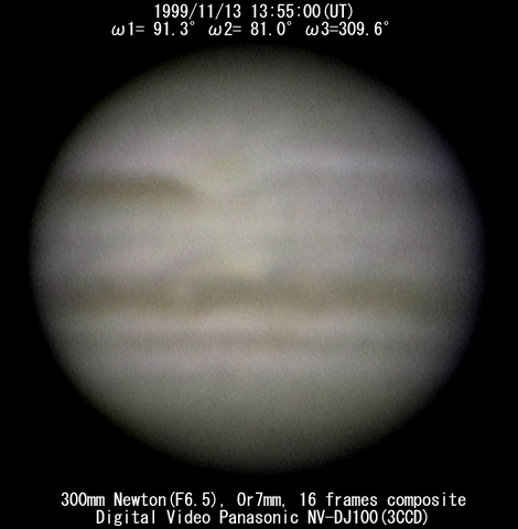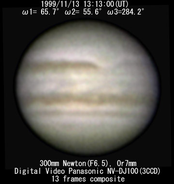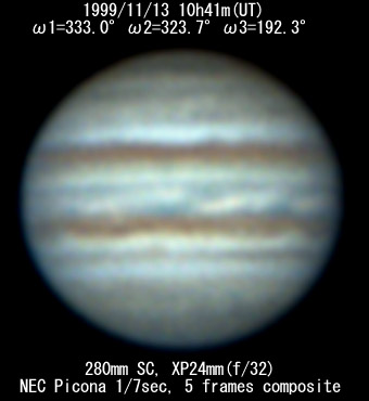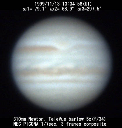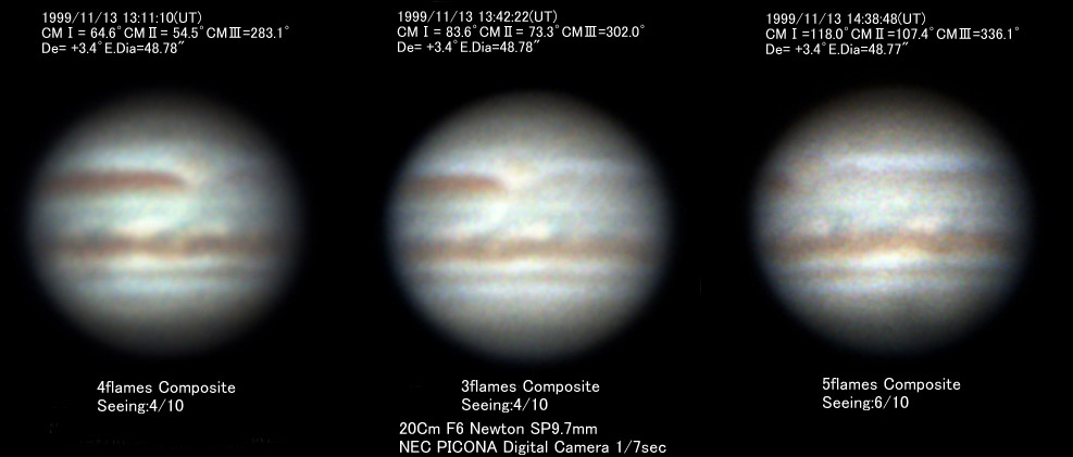 1999/11/13 15h35m09s(UT) I=152.4 II=141.5 III= 10.1 7 frames composite 1999/11/13 15h42m50s(UT) I=157.1 II=146.1 III= 14.8 6 frames composite 1999/11/13 17h25m50s(UT) I=219.9 II=208.4 III= 77.1 6 frames composite 1999/11/13 17h39m15s(UT) I=228.1 II=216.5 III= 85.2 4 frames composite Telescope : C11 (SC) D=280mm fl=2800mm Camera :Minolta DimageEx1500 Digital Camera taking lens removed Effective F No.: 25 (XP24mm Eyepiece Projection) Filter: IR cut & Low-pass built-in the camera Obs.site : Mozuhonmachi Sakai-City Osaka Japan Exposure : 1/8 sec, Analog gain:6dB Seeing:5/10 Transp.:4/6