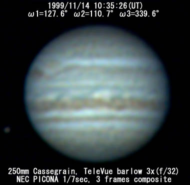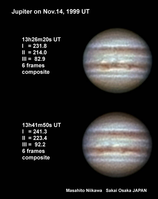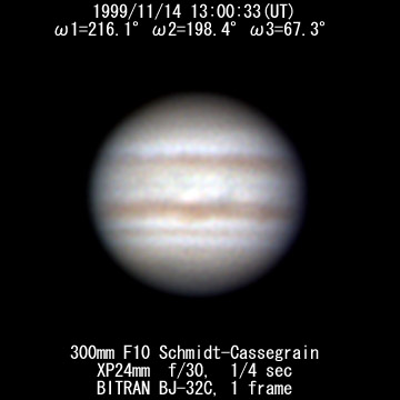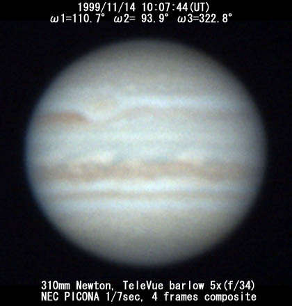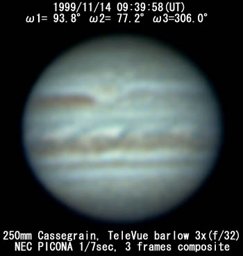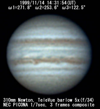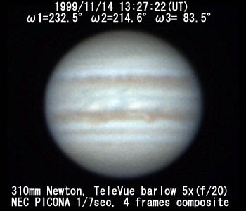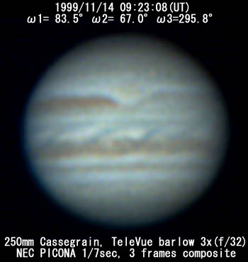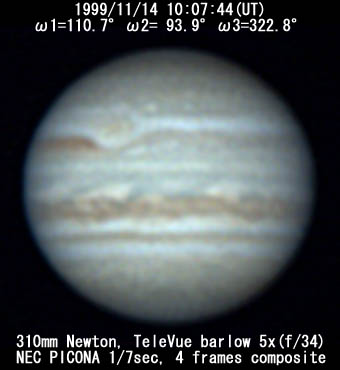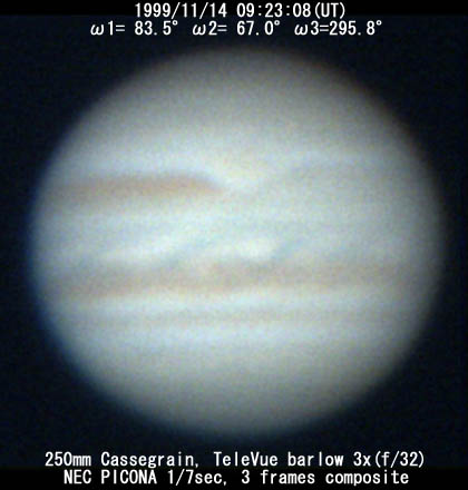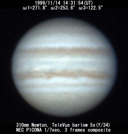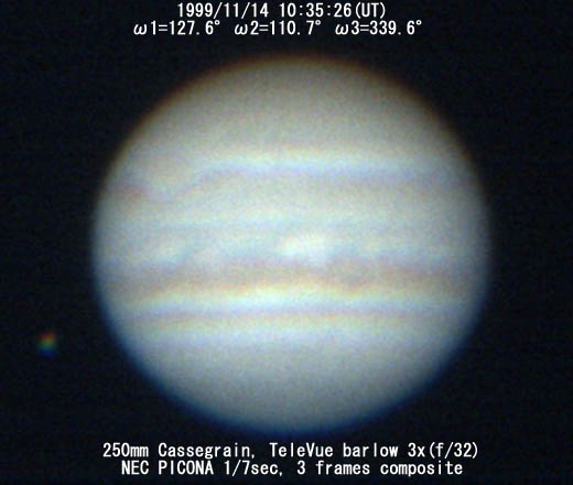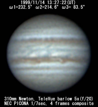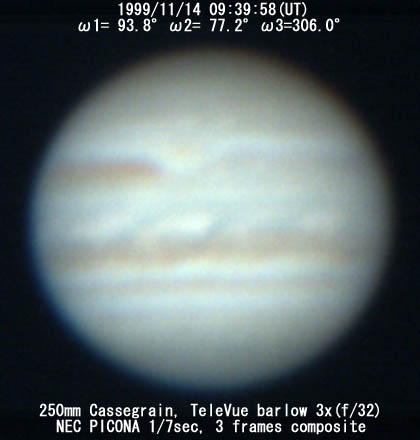 1999/11/14 13h41m50s(UT) I=241.3 II=223.4 III= 92.2 6 frames composite Telescope : C11 (SC) D=280mm fl=2800mm Camera :Minolta DimageEx1500 Digital Camera taking lens removed Effective F No.: 25 (XP24mm Eyepiece Projection) Filter: IR cut & Low-pass built-in the camera Obs.site : Mozuhonmachi Sakai-City Osaka Japan Exposure : 1/8 sec, Analog gain:6dB Seeing:3/10 Transp.:3/6