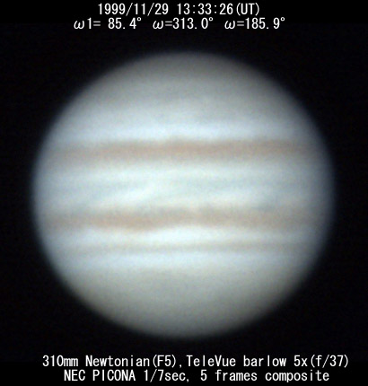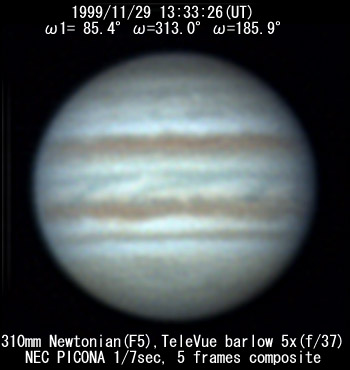 ![]() 1999/11/29 13h34m(UT) I= 84.4 II=312.1 III=186.0 1999/11/29 14h39m(UT) I=124.0 II=351.3 III=225.3