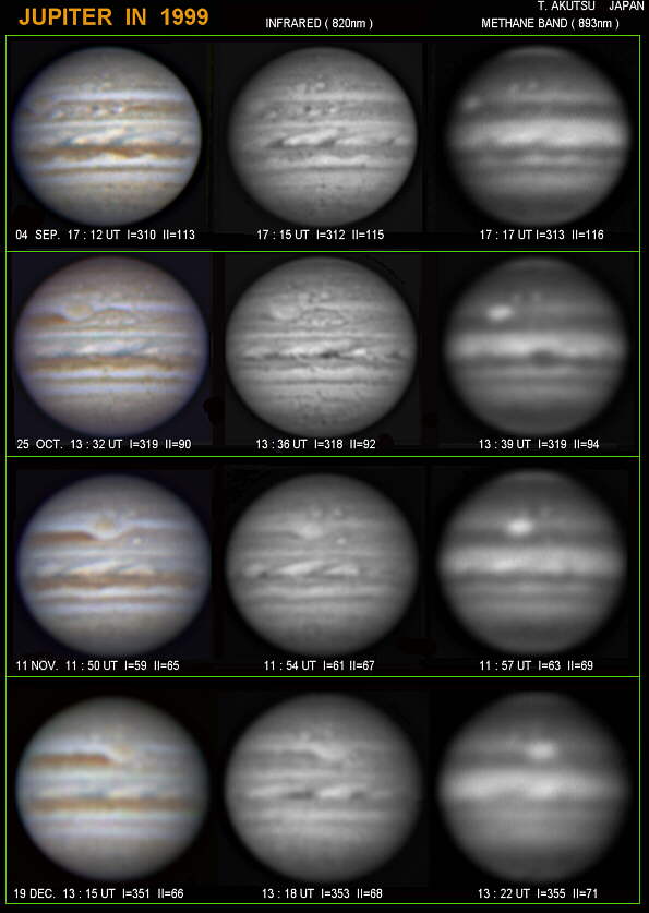 I hope you all enjoyed the 2000 New Year. I express also my sincere thanks to those who sent me precious planetary images last year. Attached find please a set of my Jovian images taken from September to December 1999. I began to use a Japanese made methane-band filter(893-897nm with a width 1/2 lamda=6.5nm). I think these images show the area where BE and FA are just joining. I produced an image of Mars on 28 December, which will be reviewed in CMO 227 (coming issue). I hope you also keep me informed of your work on Jupiter and other planets.