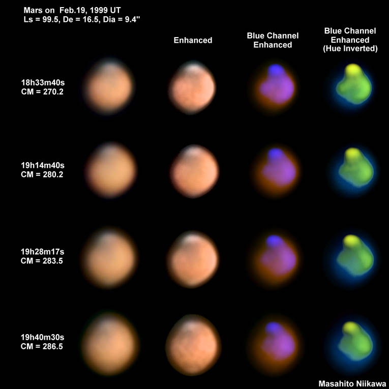 Masahito Niikawa (280mm SC, Digital still camera Minolta DimageEx1500)![]() 1999/02/19 Ls = 99.5゚ De =+16.5゚ Dia = 9.4" Seeing:4-5/10 Transp.=3/6 18h33m40s(UT) CM = 270.2 6 Flames composite 19h14m40s(UT) CM = 280.2 6 Flames composite 19h28m17s(UT) CM = 283.5 7 Flames composite 19h40m30s(UT) CM = 286.5 4 Flames composite |