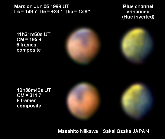 1999/06/04(UT) Ls = 149.7, De = +23.1, Dia = 13.9" 11h31m50s(UT), CM = 295.9, 6 frames composite 12h36m40s(UT), CM = 311.7, 6 frames composite |
