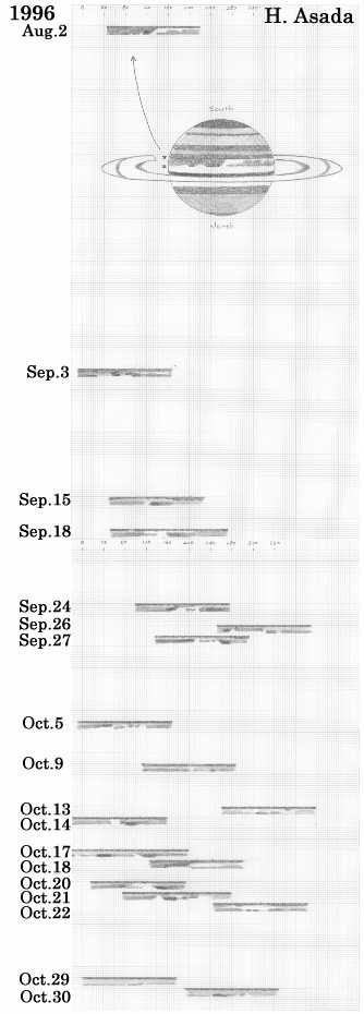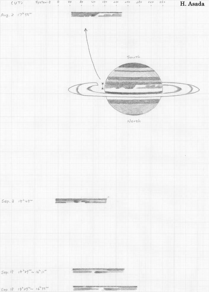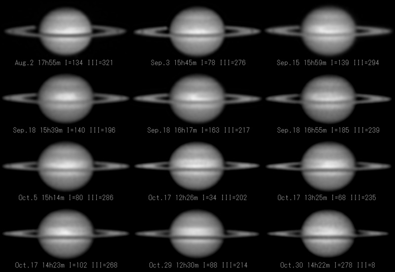 土星のSEBn〜EZsに8月以降、ベルト状の暗斑が出現しているので、その様子を報告する。 今回は、一部を除き、眼視観測では模様の存在を確認するに留め、位置はCCDイメージから求めている。 暗斑を最初に確認したのは8/2のCCDイメージである。それは、SEBnの一部がEZ側に膨らんでいるように見えた。眼視観測で暗斑を確認したのは9/18。その時、暗斑はSEBnから少し離れ、EZsに新たなベルトが形成されたように見えた。 その後の観測で、暗斑はベルトに見える部分と、細くstreak状に見える部分があることを確認している。また、ベルトと別のベルトの隙間は相対的に明るく見え、悪条件での観測時には明斑に見える。しかし、明斑に輝度はなく、現在のところ、それは少なくとも1994年のEZnの白斑よりは暗く、単に暗斑の隙間と見ている。