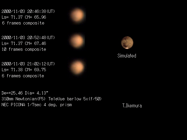 2000/11/03 20:46:38(UT) Ls= 71.37 CM= 65.96 De=+25.46 Dia= 4.13" 6 frames composite 2000/11/03 20:52:48(UT) Ls= 71.37 CM= 67.46 De=+25.46 Dia= 4.13" 10 frames composite 2000/11/03 21:02:12(UT) Ls= 71.38 CM= 69.75 De=+25.46 Dia= 4.13" 11 frames composite 310mm Newtonian(F5) TeleVue barlow 5x(f/50) NEC PICONA 1/7sec 4 deg. prism | ||