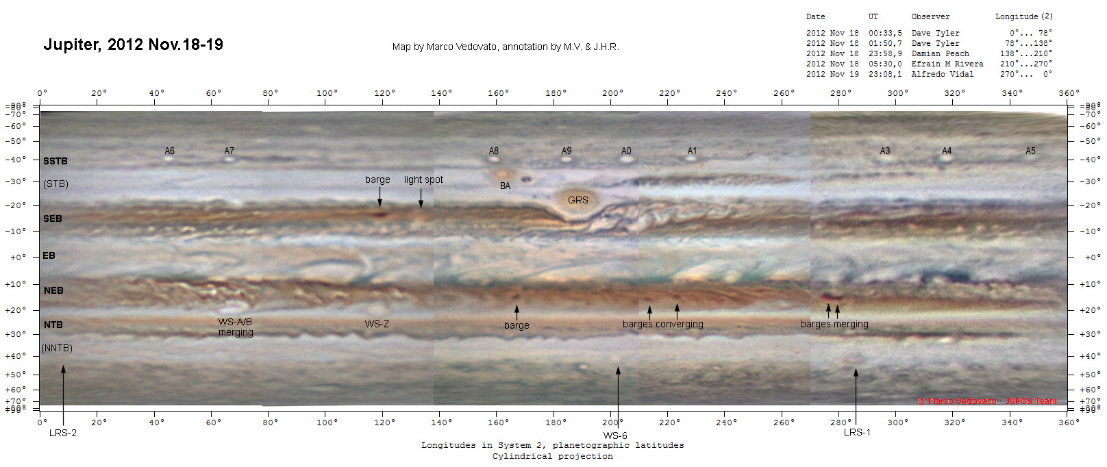 Hello all, Just a quick update on the rapid changes in the NEB, which many observers have been remarking on: After the completion of the Revival of the NEB, the belt is now showing increasing large-scale activity again. The large rifted regions have spread extensively around the belt, and more anticyclonic white ovals (AWOs) and small brown barges have developed within its northern half - while, conversely, observers have been keenly following the merger of two AWOs and the merger of two barges. The AWOs and barges at present include the following, in order of longitude. One large white oval at L2 ~ 70 resulted from the recent merger (although we still need to establish exactly what happened to any other remnants). White spot Z is a prominent AWO at L2 ~ 120, sometimes showing complex structure. The many superb images of the GRS region in recent days have shown two interesting events involving small barges. First, a barge at L2 ~ 165 appears to have split, as it was encircled by light clouds in the wake of a rifted region - though it's possible that the 'daughter' barge will not persist. Second, another pair of barges at L2 ~ 210/220 have converged and will be merging over the next few days. There is a small AWO at L2 ~ 260 which seems to have had one or more companions; and at L2 ~ 270 is the long barge resulting from a recent merger. The AWO which appeared to form at L2 ~ 350 on Nov.14 has not persisted as a major oval, though some circulation may remain there.