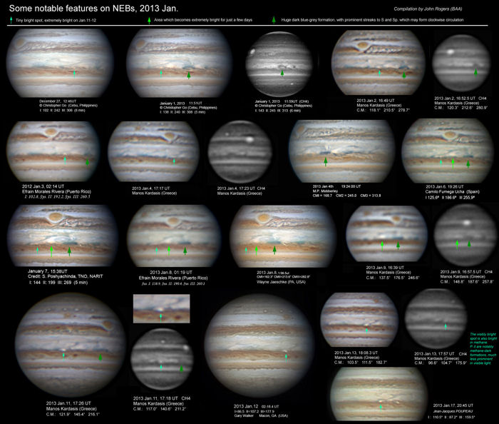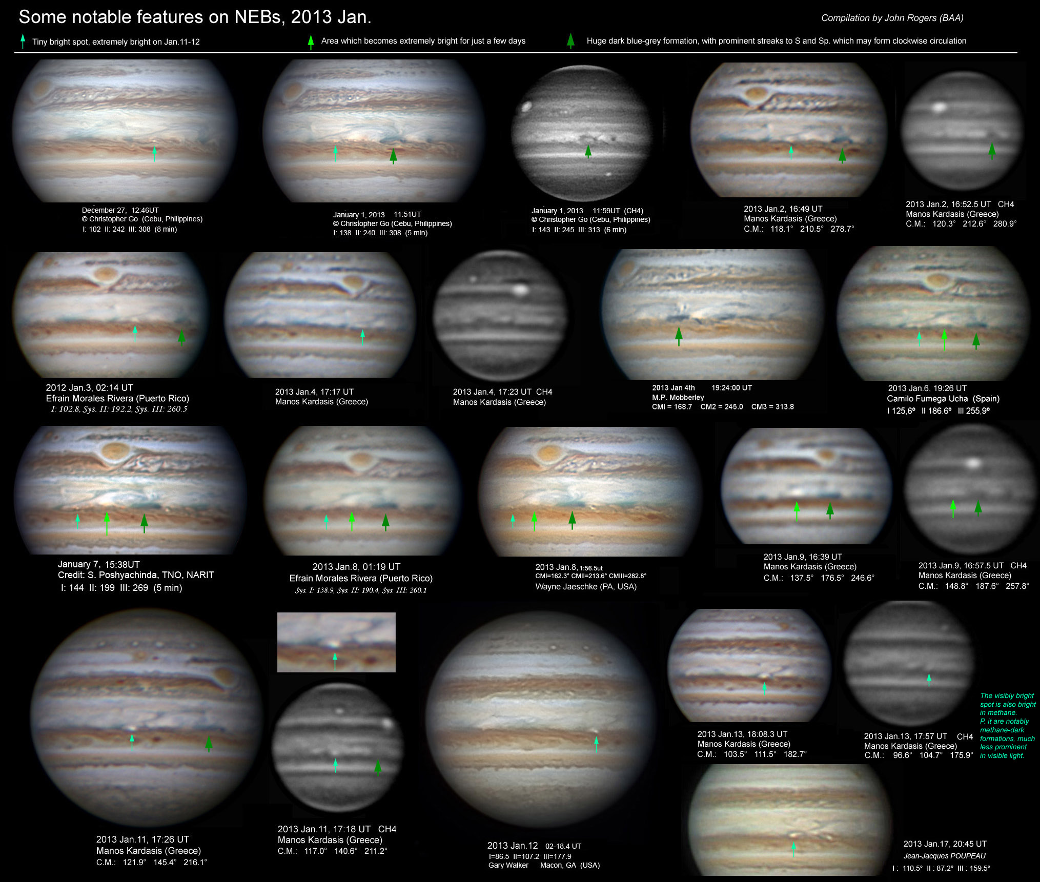 皆さんへ、 Manos KardasisやChris Goやその他の観測者が指摘しているように、新年以降、大赤斑を通過したり大赤斑前方の赤道領域に注目すべき模様がある。これらを添付した2枚の組画像に示す。 これらの模様の一つで、L1=約60度付近のものは、新しい南赤道攪乱【South Equatorial Disturbance(SED)】と思われる。我々は秋に潜在的なSEDを追跡していて(これについてのレポートは公開されようとしている)、12月28日に大赤斑を通過した後に、SEDの特徴的な形態で(期待したように)出現した。メタン画像では、外観は(まだ)それほど典型的ではないが、その前端にいくつかの特に暗いストリークが見られた。これは1999〜2009年に存在していたもののような、別の長寿命なSEDの始まりかもしれない。しかし、我々は待って、それが実際に持続するかどうかを確認する必要があるだろう。 L1=約110-150度付近の、もう一つの模様のグループは北部EZにある、2個の非常に明るい白斑(これらは拡張のきざしではないけれども、NEBsのダーク・プロジェクションに関係した古典的なプルームに似ている)で、NEBsのダーク・プロジェクションの大規模な例が後方にある。このプロジェクションは、探査機で観測されたように、時計回りの循環を思い起こす、北部EZの非常に複雑なストリークと関係している。 両方の画像セットとも多くのメタンバンド画像を含んでいるが、これらはEZに様々な興味深い模様を見せている。
