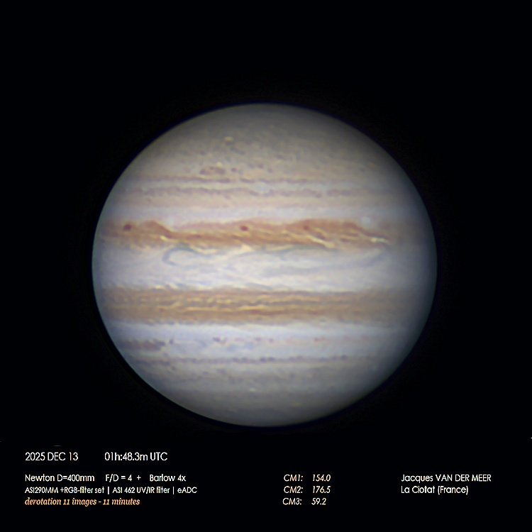 attached image of Jupiter under poor seeing. CDK20 with 533C,3 mins derotated.