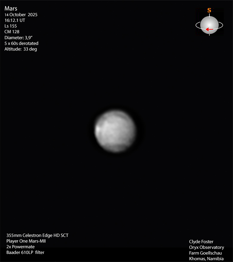 R610LP Image from this afternoon. Valles Marineris is to the upper left of centre, with Solis Lacus coming into view on the upper left limb. Mare Sirenum is near the upper right. Propontis I is at lower right, with Propontis II, Scandia and Nerigos/Boreum extending across the bottom of the planet.[Clyde Foster : Khomas,Namibia]