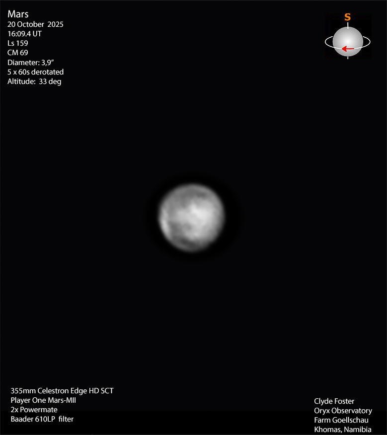 Niliacus Lacus and Mare Acidalium are at lower left.Mare Erythraeum is at upper left, with maybe a hint of lightness over/in Argyre on the upper left limb.