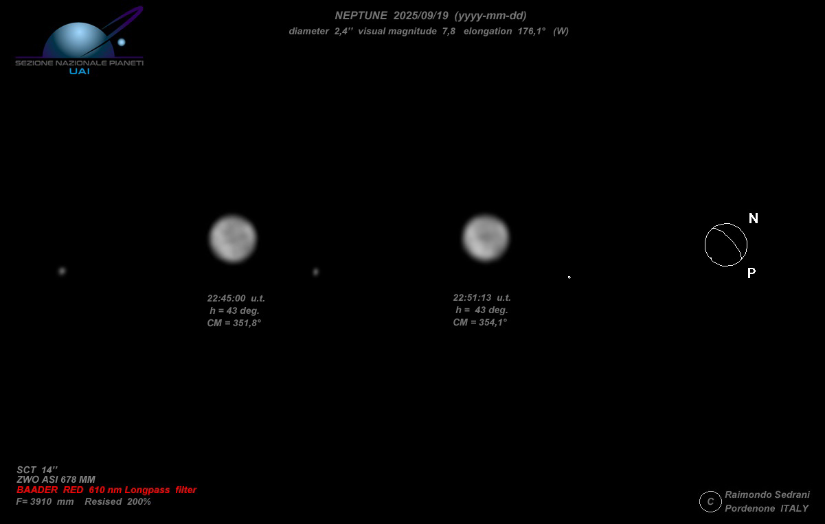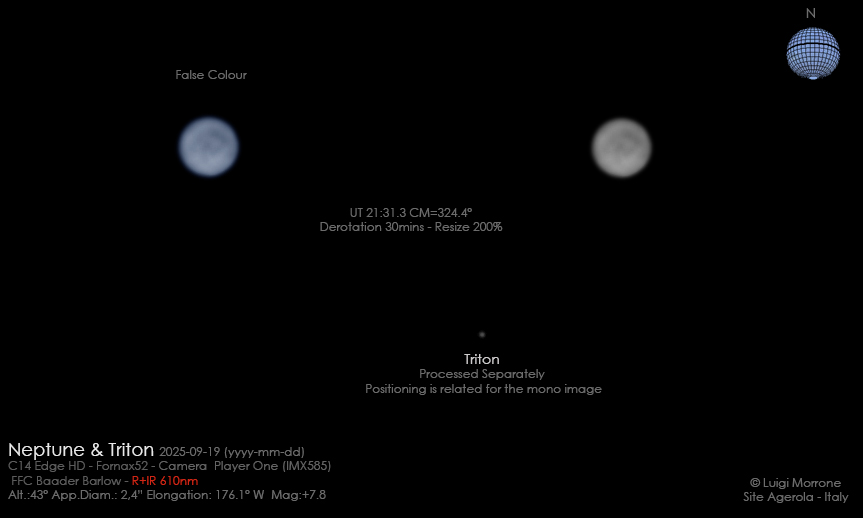 Good seeing conditions Some cloud features on the globe. The orientation is confirmed by the position of Triton. The false color image is only for aesthetic reasons[Luigi Morrone : City Agerola Italy]