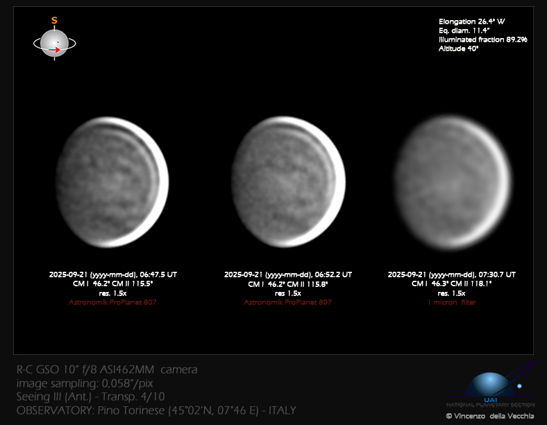I continue my series on Venus, now moving toward superior conjunction and increasingly smaller. I also used the 1 micron filter, which didn't reveal any further detail; in fact, it shows lower contrast. No CD detected.[Vincenzo della Vecchia : [Aversa,Italy]