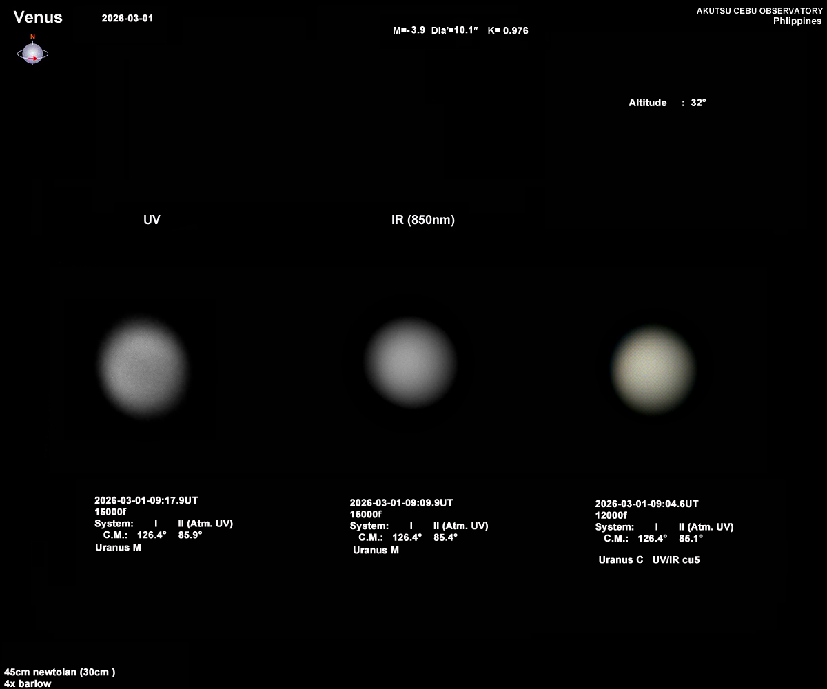 太陽から少し離れ(約13度)れてきた金星が撮れるるかな?と撮像しました。 まだ太陽に近いので太陽が西に傾いた夕方に自動導入で入れて覗くとほぼ円形の小さな金星です。 視直径は10.1″と小さいが明るい天体なので5cmファインダーで見えます。 UV画像では北側(上)周辺が少し明るいと分かるだけです。≪Cebu PHILLIPINES 阿久津富夫≫