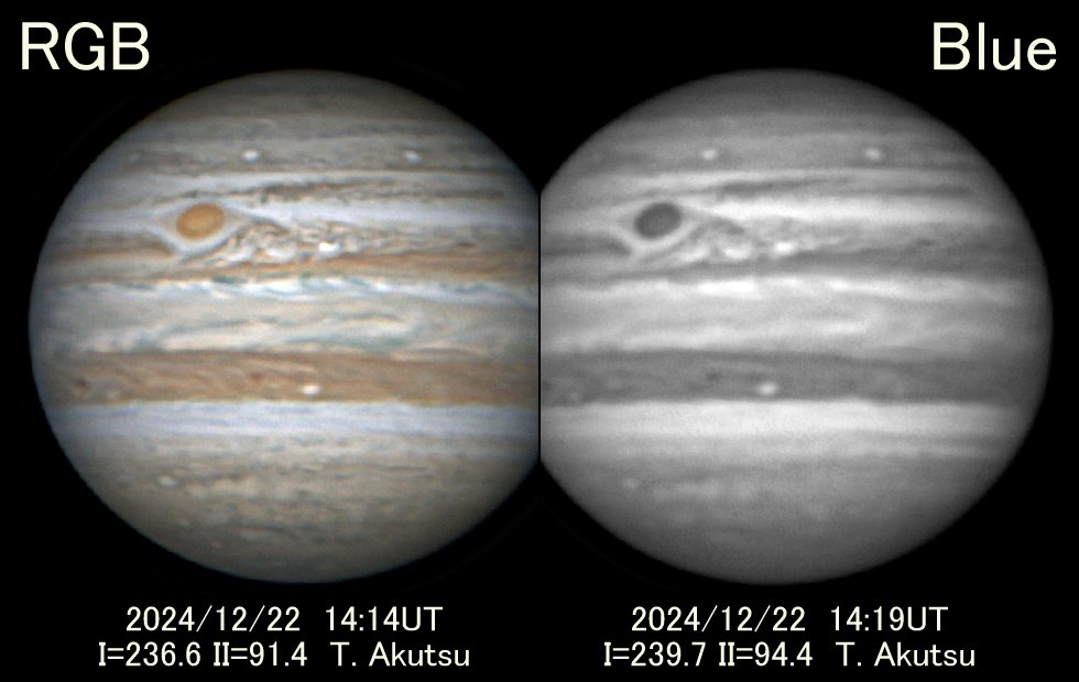 月惑星研究会の惑星画像アーカイブに掲載されている、たくさんの画像を見ると、木星の色調はさまざまです。 撮像する際のカラーバランスや、画像処理の諸条件などが影響しているようです。 同じ木星のうす黄色でも人によって感じ方が違うので、どんな色調に仕上げるかは、観測者ごとに独自のやり方とこだわりがあります。 例会で画像の色が話題になると議論百出で、統一した色調にすることは難しそうです。